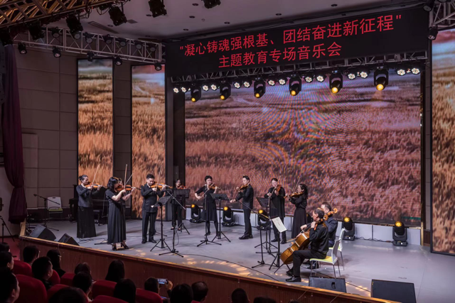 音乐会上,由我系李倩、徐知、杨云、柯曦等老师及学生演奏了弦乐合奏《在希望的田野上》和《我和我的祖国》。