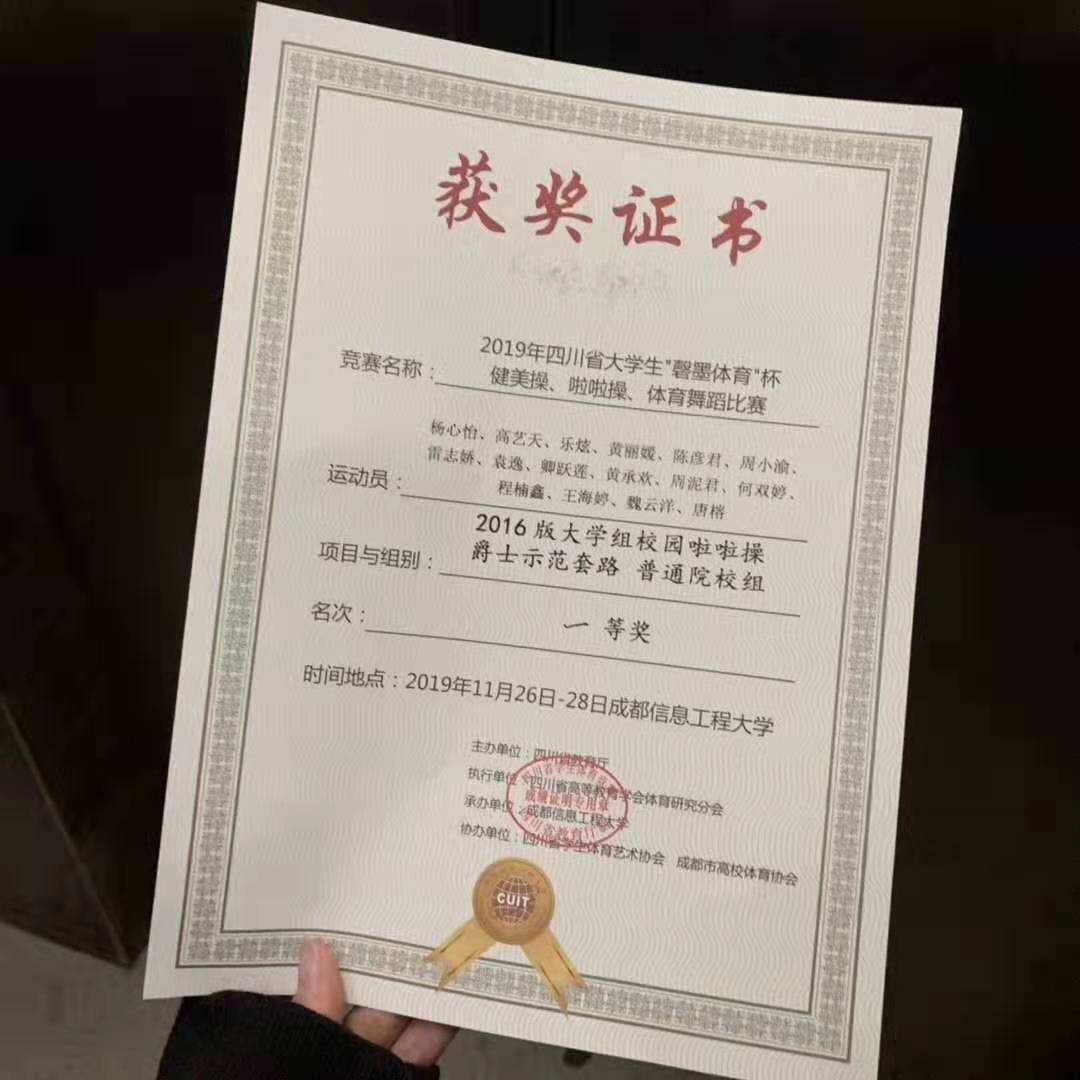 2019年11月26日至11月28日由四川省教育厅主办成都信息工程大学承办的2019年四川省大学生健美操啦啦操体育舞蹈比赛在成都信息工程大学隆重举行,本次赛事共吸引了四川大学、电子科技大学、西南交通大学、四川师范大学、成都体育学院等40多所高校1300多名运动员参赛。 本次比赛受到学院领导以及基础部领导的高度重视。参加校园啦啦操爵士动作项目的17名队员全部来自音乐教育学院,在廖恒、罗爽等老师的悉心指导下,她们以热情饱满的精神状态在比赛中努力拼搏,赛出了水平,赛出了风格,获得了校园啦啦操爵士动作所有参赛组别第一名以及普通院校组“一等奖”。 通过此次比赛,不仅展现了川音学子努力拼搏、团结一心的精神,而且向四川省高校展现了beat365在线唯一官网体育教育的风采,在此我们向获奖同学表示祝贺,向负责此次比赛的指导老师表示衷心的感谢!
