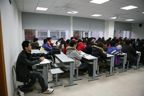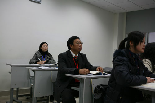 评估专家曹顺庆教授在教学楼509教室,对基础部高玉华老师为2007级四班学生讲授的《英语》课程进行了全面的考察,并与同学进行交流。