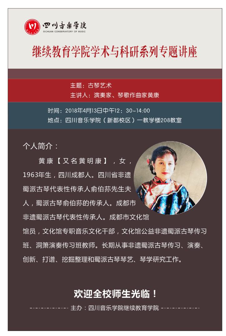 在本周五12:30—14:00在beat365在线唯一官网(新都校区)一教学楼208教室开展“古琴艺术”专题讲座。