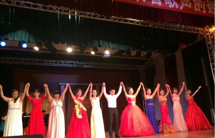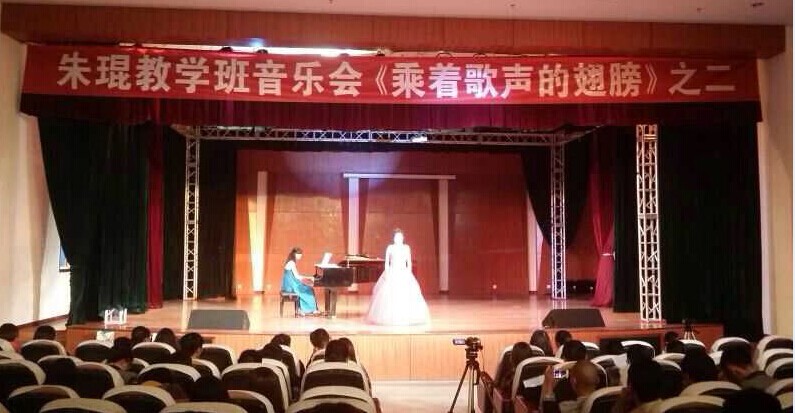 2014年11月12日下午4:00,朱琨老师教学班音乐会在我院新都校区演艺厅隆重举行。音乐会由继续教育学院主办,朱琨老师声乐组2012、13、14级声乐表演学生承办,音乐会由李明倩主持,赵赟老师担任钢琴伴奏。继续教育学院姚春城副院长、甄志刚书记、声乐教研室主任吴静副教授以及专科部的教师和学生观看了音乐会。    教学班全体女生以一曲《乘着歌声的翅膀》将音乐会拉开了帷幕,接着是李宇翔同学的《草原上升起不落的太阳》,时而激昂、时而柔肠。接着胡蝶的《曲蔓地》、林芯忆的《半屏山》、陈红利的《长城谣》、徐颖的《尼娜》都如同流水般缓缓地向我们涌来,似乎要将我们带进这充满爱的天地里。     本场音乐会由2012级李明倩同学主持。她主持激情澎湃,而且将作品的背景和艺术价值一一讲述和介绍。罗惠文的《火把节的欢乐》完整的唱出了这首作品的时代、背景和味道,漂亮的音色与出色的表演将本次音乐会推向了高潮,掌声不断,接着杜婷演唱的《你发火,我就生气》、《美妙时刻即将来临》以及曾晓演唱的《你去向何方》、《小路》等都将本次的音乐会完美地进行。     最后由教学班的全体学生以一曲《感恩》,用他们那深情的表演和美妙而婉转的歌声对朱琨老师一直以来的栽培表示感谢,对为本次音乐会作出辛勤工作的老师和同学们表示谢意。     音乐会圆满落幕,到场的领导和老师上台跟演员合影留恋。