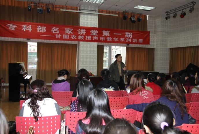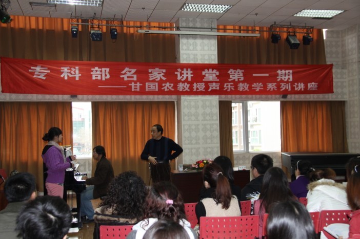 2011年4月8日下午2:30于琴房大楼二楼多功能厅,甘国农教授为专科部师生带来了一场生动活泼的声乐教学。 在讲座上,甘国农老师引经据典、因材施教,非常有针对性的对几位声乐示范学生进行了深刻的剖析,场内不时响起热烈的掌声,每个人都被甘老师精彩的教学所吸引。整场讲座进行了2个小时,取得了圆满成功。 讲座结束后我部领导进行了认真的总结并同广大师生交流此次讲座的心得和感受。 本次声乐讲座只是我部系列学术讲座的第一期。我部将秉着提高教师教学水平、开阔广大师生眼界、激发学生学习积极性的宗旨开展不同专业不同类别的专家讲学活动 !