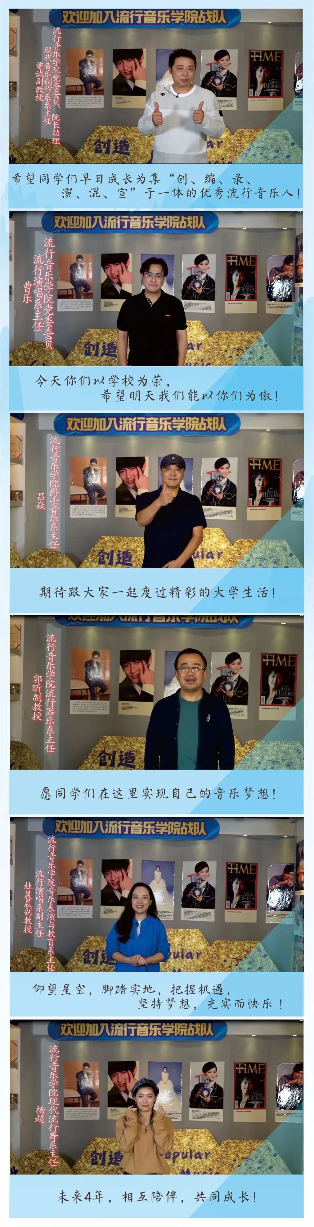 流行演唱系、流行器乐系、爵士音乐系、现代音乐制作系、流行音乐表演与教育系、现代流行舞系六位系主任齐上阵,与新同学们云端相见。