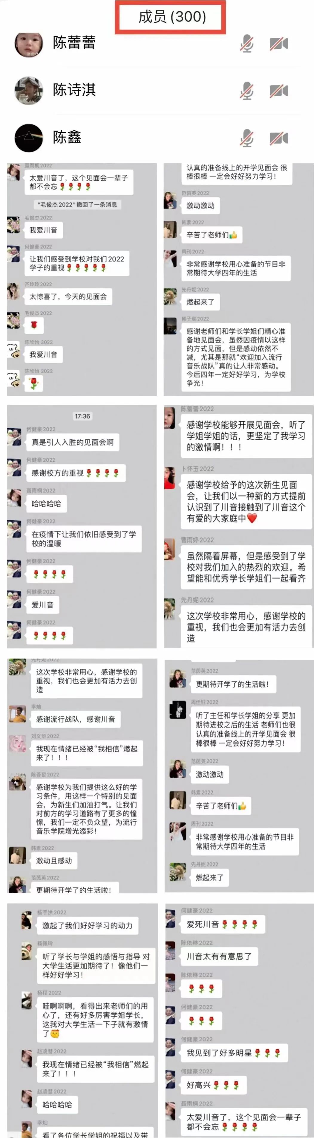 四十余分钟的见面会,精彩不断,身处大江南北的2022级新生,持续守候在线上,见面会同步在线人数达到平台最高上线。300余名师生线上线下济济一堂,共同感受着流行音乐学院大家庭的热情与温暖。同学们迫不及待地发表感受:“这样的见面会终身难忘”“感谢川音,感谢流行”“倍受感动和鼓舞”“在疫情下依旧能感受到学校的温暖”…… 他(她)们纷纷表示要努力成为最棒的川音人。