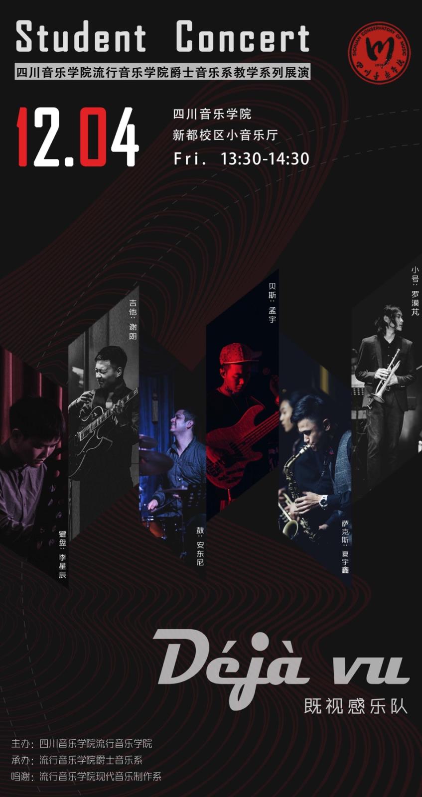 本次展演活动的三场演出分别为:获得“爵士高手 乐坛争霸”爵士乐大赛乐队组一等奖的“Déjà vu(既视感)乐队”的音乐会、由爵士音乐系2019级、2018级、2017级优秀学生乐队与合奏课老师们共同精心排练的一场高质量的音乐会、由川音流行音乐学院爵士大乐队带来的精彩绝伦的爵士大乐队音乐会。