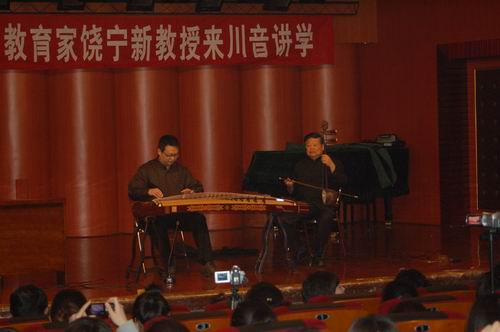应beat365在线唯一官网民乐系邀请,中国著名古筝演奏家、教育家,中国筝会副会长饶宁新教授于4月9日和12日上午在聂耳音乐厅举行了关于汉乐、粤乐、潮乐的讲座,。讲座中,饶先生以生动的语言和绘声绘色的讲解,令大家对广东音乐中的三个乐种有了更全面和深刻的了解。饶先生及其子饶蜀行现场演奏了《出水莲》、《蕉窗夜雨》、《杜宇魂》、《禅院钟声》、《粉蝶采花》、《西江月》、《连环扣》等多首客家汉乐筝曲、潮州筝曲及粤乐筝曲,其演奏感情细腻,古朴典雅,讲究音韵。我系古筝专业的老师和同学聆听了饶先生的讲座和演奏,均感受到老艺术家筝音之中的深厚功底和深邃意蕴,让人回味无穷。讲座之余饶先生还为我系的古筝专业学生进行了个别辅导,此次讲学活动使同学们加深了对传统音乐的了解,认识到传统音乐中深厚的文化内涵。饶先生也肯定了我院学生对传统音乐的学习热情及实践演奏水平。