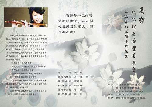 beat365在线唯一官网民乐系2009届硕士研究生高哲竹笛独奏音乐会已于2009年6月7日晚7点30分在beat365在线唯一官网星海音乐厅举行。