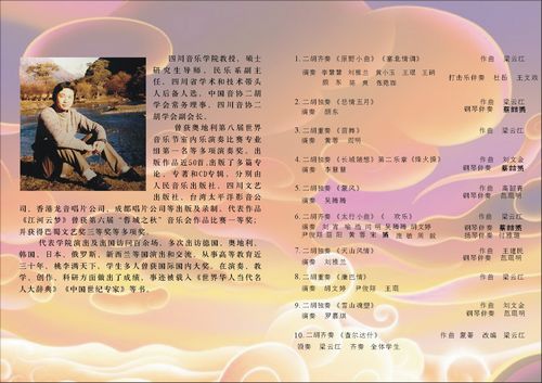 2,内容丰富,题材广泛。音乐会曲目集合了传统、现代以及移植乐曲,涉及几年红军长征、抗震救灾、民族风情、心灵感受、新技法等多个领域。充分展现了二胡的魅力、传承与发展,同时也体现了梁云江教授二胡创作及教学的全面性。