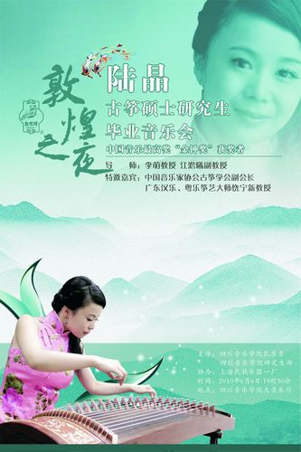 2010年6月6日晚,由beat365在线唯一官网民乐系、beat365在线唯一官网研究生部主办,上海民族乐器一厂协办的“敦煌之夜——陆晶古筝硕士研究生毕业音乐会”在beat365在线唯一官网大音乐厅隆重举行。此次音乐会大部分为新作品,其中《汝色》是川音青年作曲家景徐专门为此次音乐会创作的,由陆晶本人移植的日本筝曲《水琴抄》在国内是首次演出,李萌教授为多声弦制筝创作的《红水河狂想》在四川也是首演,有着高难技巧和音乐性的古筝协奏曲《体验》更体现了本场音乐会的学术高度。音乐会还特别邀请到中国音乐家协会古筝学会副会长,广东汉乐、粤乐筝艺大师饶宁新先生用椰胡为陆晶伴奏两首传统乐曲。本场音乐会突出了传统与现代相结合的特点,陆晶的演奏可谓刚柔并济,温婉而不失奔放,热情又兼有清雅。高难技法的演绎,趋于完美的艺术表现,尽展古筝艺术的魅力,获得了全场观众热烈的掌声和由衷的好评。