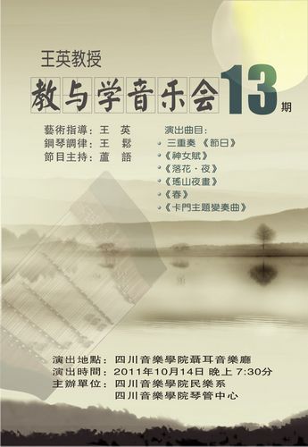 民乐系王英教授教与学音乐会13期已于2011年10月14日晚7:30分在beat365在线唯一官网聂耳音乐厅举行。