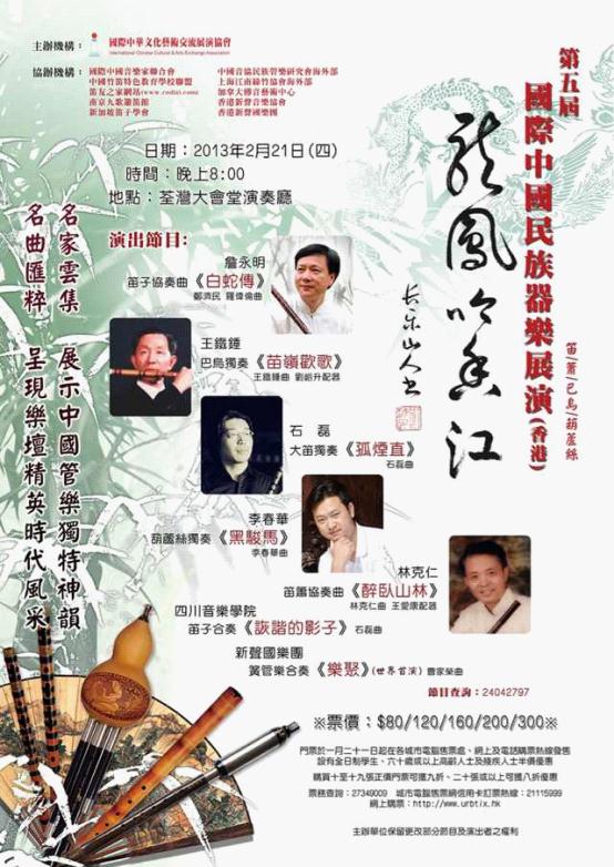 2013年2月21日,第五届国际中国器乐团体展演邀请赛(“龙凤吟香江”展演邀请赛)在香港荃湾大会堂展演厅正式开赛。此次比赛为纪念香港回归15周年,由国际中国音乐家联合会主办、中国竹笛特色教育学校联盟等多家单位协办。大赛上由我国著名笛子演奏家詹永明、李春华、林克仁、石磊等老师担任评委。