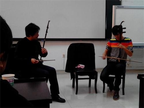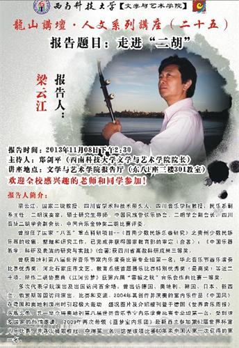 2013年11月8日下午,西南科技大学文学与艺术学院学术报告厅座无虚席,应该大学邀请,beat365在线唯一官网民乐系梁云江教授专程赴绵阳为西南科技大的师生作了《走进二胡》专题学术讲座,并举行了二胡大师课,这是该校“龙山讲坛•人文系列讲座”的重要内容之一。梁教授由浅入深、用生动丰富的语言向广大师生讲述了“怎样欣赏二胡音乐”“怎样练琴”。从声音到内容,从弦律到感受,一步步引导人们走进二胡的美好音乐中。在场的两百多名听众有该校的师生、有绵阳市的音乐工作者、还有专程从三台江油等地慕名赶来的外地二胡和音乐爱好者。大家无声无息、认真地听着讲解,许多人还记着笔记,梁教授风趣幽默而丰富的语言深深感染着听众,现场不时爆发出欢快的笑声和热烈的掌声。 讲座后,梁教授现场亲自演奏和指导文艺学院的学生,使大家又一次感受了二胡的魅力,在长达两个半小时的活动中,大家始终情绪饱满,气氛热烈,对于现场提出的各种问题,梁教授一一作了解答,获得大家热烈的掌声和好评。 随后,梁云江教授被聘为西南科技大学艺术学科兼职教授,由该校文艺学院院长为梁教授颁发了聘书。