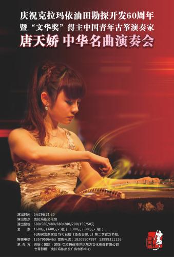 由克拉玛依市世纪东方文化传媒有限公司等多家企业联合主办“欢庆克拉玛依油田成立60周年”,特邀“文华奖”得主----中国青年古筝演奏家唐天娇赴克拉玛依举行中华名曲演奏会。