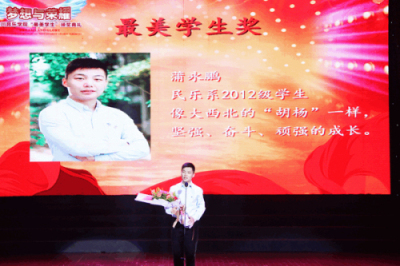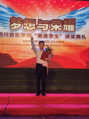 “梦想与荣耀,我是蒲永鹏。”铿锵的话语说出了他对梦想的坚持,他是来自大西北的“胡杨”,不惧困难,不畏艰苦。学习音乐对于一个普通的农村家庭来说并不轻松,他深知这点在大学期间不敢有丝毫松懈,在学习竹笛的同时还申请了第二专业,并代表民乐系夺得了2013年beat365在线唯一官网“三爱”主题校园歌手大赛业余组一等奖的好成绩。“像大西北的“胡杨”一样,坚强、奋斗、顽强的成长。”这,是他的座右铭。“你准备好了吗?这是你贴在床头给自己的警言,正是这样的自我鞭策你选择了双专业,你的歌声嘹亮,你的竹笛悠扬,你组建了自己的乐团,你在学院里吹拉弹唱,天天向上。你作为中韩文化交流的使者,尽情释放中国的正能量。生而三千年不死,死而三千年不倒,倒而三千年不朽,你这个在川音成长的西北汉子,就是东方永远昂首的胡杨。”正如颁奖词说的一样,蒲永鹏一定会绽放属于他的辉煌。