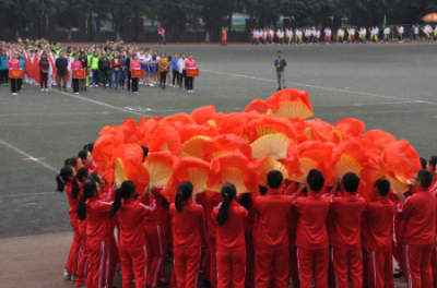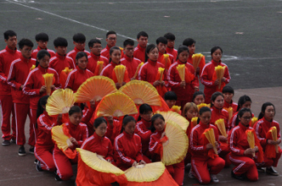 在今年的开幕式中,我系突破了传统的歌、舞等形式,取而代之的是更为新颖的舞扇表演,同学们双手持扇通过形状、队形的变换,彰显我系在这次开幕式中所要表达的主题——歌颂祖国。排练期间,老师及学生干部曾对表演内容进行多次修改,力求做到尽善尽美;我系同学们以饱满的精神,认真的态度,高标准、严要求进行开幕式及广播操的训练,以求在开幕式、广播操比赛中以出色的表演展示我系学生的积极向上,斗志昂扬的风采。