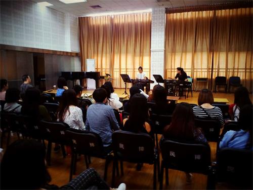 5月25日下午2点30分,民乐系青年扬琴教师付雅璐在民排厅开展了她的首次教学公开课,吸引了民乐系扬琴专业老师和很多学生前来听课。 付老师和她的学生冉梦乔围绕《金翎思——满乡随想》这首作品,对音乐情感表达进行了深刻探讨。付老师通过不同的教学展示方式,通过对比不同乐段,引导学生慢慢体会情绪的递进变化。她亲自示范作品强弱对比、从慢到快,段落间的衔接处理等,声情并茂,加强学生对作品的理解;她通过歌唱旋律感受,引导学生体会作品的情绪变化,增强乐感;她演绎曲式结构中乐句的对比变化,并让学生感受她的演奏力度和速度如何带动情绪的变化,理论和实践相结合。此外,付老师特别提到以下几点与我们分享:其一,从作品中对轮音密度的要求和三连音齐竹的整齐划一谈到了基本功训练的重要性,同时也体现了付老师教学中的拓展性思维;其二,节拍器等于神器,平时练习中要养成用节拍器的习惯,用节拍器规范演奏;其三,付老师强调了学生对于乐谱谱面的准备理解的重要性,包括谱面上的演奏技法,音乐符号等等。 这场公开课持续了半个小时左右,同学们整场全神贯注的聆听,付老师也以她严谨认真的教学态度给她的学生,也给我们每个人都上了一堂细致精彩的公开课。虽然这是付老师第一次上公开课,但她展现了自信的微笑、精湛的技艺以及对学生充满细致耐心的指导和孜孜不倦的敬业精神,让每个人都受益匪浅。祝愿付雅璐老师的教学道路顺利,越来越好! 龚雅蓓