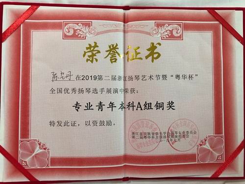 2019年7月20-24日,李雪梅老师携学生到浙江乐清参加第二届浙江扬琴艺术节。 为迎接2019建国七十周年,第二届浙江扬琴艺术节将在浙江省温州市乐清市举办。关心扬琴领域的诸多演奏家、教育家、作曲家、理论家将亲临盛会。 本届艺术节由浙江民族管弦乐学会主办,浙江音乐学院国乐系、浙江省民族管弦乐学会扬琴专业委员会协办,华音网承办,力争将本届艺术节办成一个有水准、有特色、有品质的音乐盛会。 7月22日晚,李雪梅老师本三学生李语凝 陈艺丹有幸受邀参加当晚音乐会,弹奏《雪花与回忆》。 此次艺术节中,李雪梅老师团队获得优异成绩如下: 独奏铜奖1名:陈艺丹, 优秀奖3名:李语凝 刘凤娇 张祺, 重奏组铜奖:李语凝 陈艺丹《雪花与回忆》