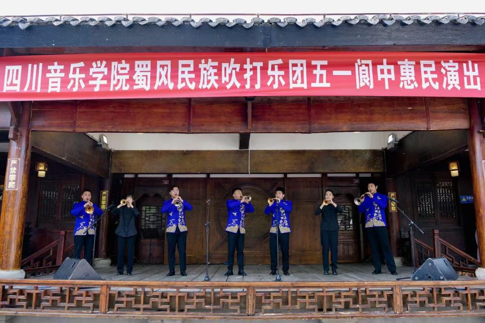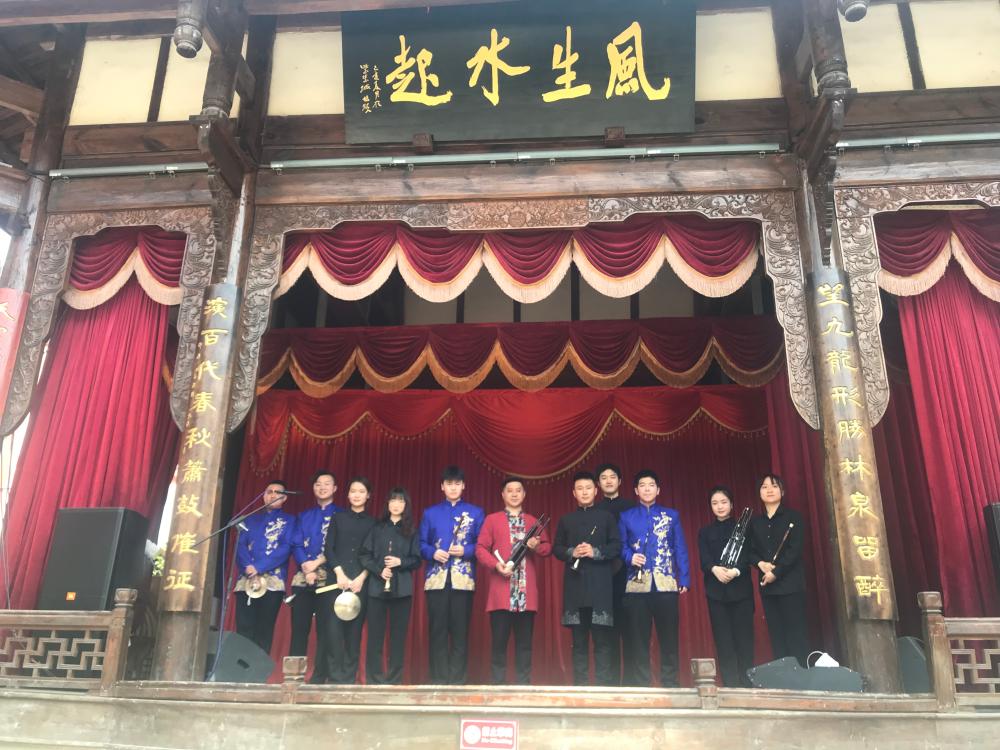 2021年5月2日上午,郑杰修副教授带领吹打乐团的同学们在阆中市天宫传统文化小镇参加了首场惠民演出活动。整场演出涵盖唢呐、竹笛、笙多种乐器以及独奏、齐奏等不同形式,演出效果极好,欢快、喜庆的唢呐声吸引了许多过路游客,台下观众络绎不绝,接连叫好。
