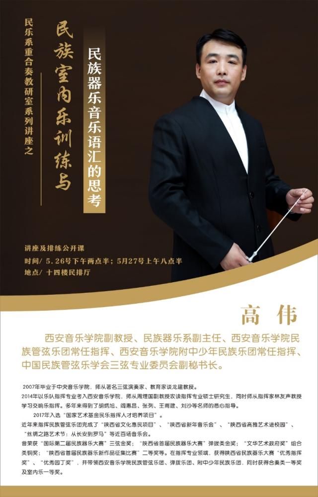 为配合我院创一流学科建设和精品课程建设,促进和提高民乐系民族室内乐演奏和教学水平,发现和培养优秀室内乐人才,推动我系全面学科建设,民乐系重合奏教研室举办了系列讲座和比赛等学术活动。特邀请中央音乐学院副教授兰维薇和西安音乐学院副教授高伟为师生们带来精彩的讲座和乐团及室内乐团排练公开课。