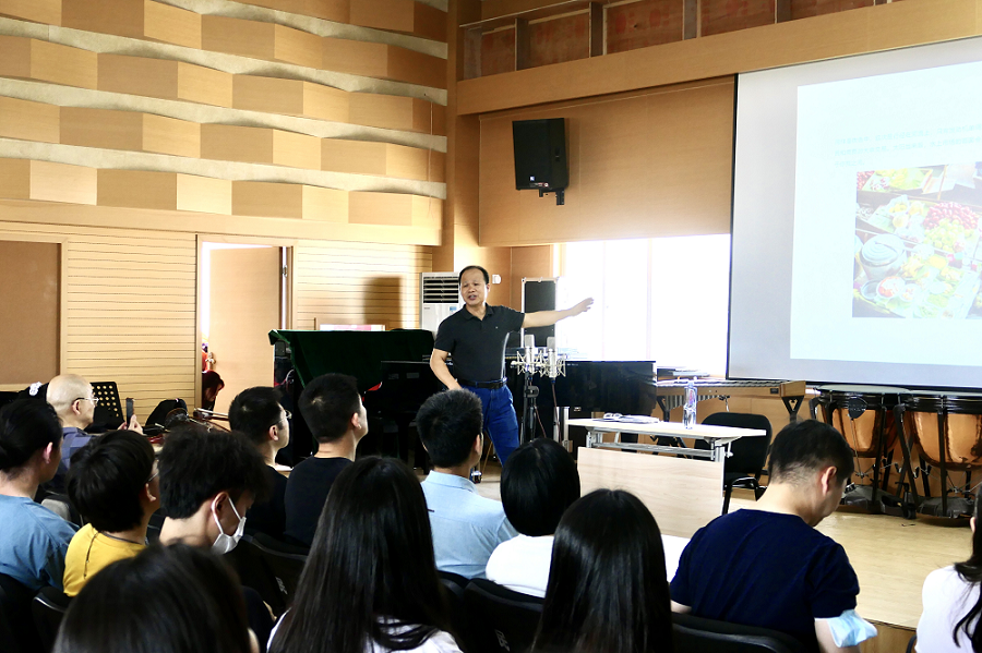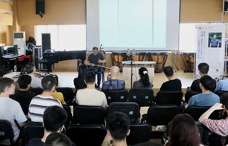 陈坤鹏教授就二弦胡琴乐器音乐共生现象的研究思路进行阐述,介绍“比较研究法”“田野调查研究法”等音乐学研究方法,为学习音乐表演的同学们开拓了眼界,点破学习器乐演奏的闭环。陈教授对其研究提出更进一步的思考,即:“中国南方少数民族擦弦乐器有无共生现象,以及其与东南亚擦弦乐器有无共生层现象?”等问题。