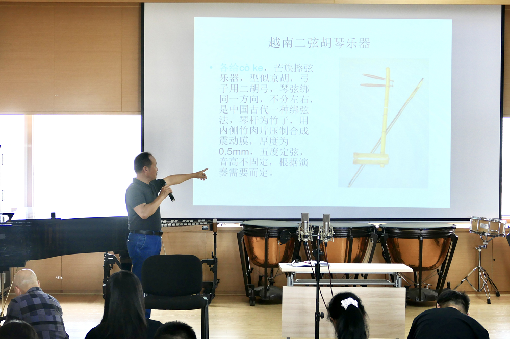 在本次讲座中陈老师从理论层面深入浅出介绍了越南的二弦胡琴乐器“各给”、“旦菓”,泰国、老挝、柬埔寨的“高音二弦胡琴”、“中音二弦胡琴”,以及三弦琴等乐器。同时,陈教授现场使用越南高音胡琴演奏越南中部民歌《家乡情》,并为大家展示泰国高音二弦胡琴(So Duang)、中高音二弦胡琴(So Wu),还邀请民乐系二胡专业的旺杰同学上台,共同演奏泰国二弦胡琴二重奏《泰国小曲》。