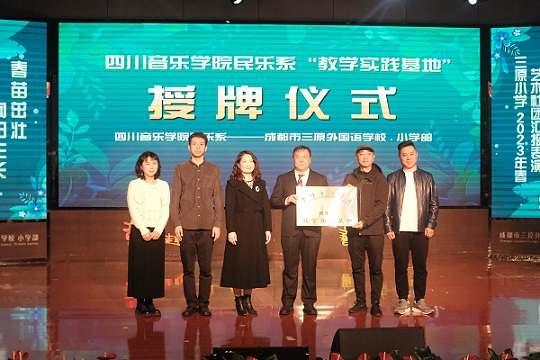 3月30日民乐系党委书记、主任张忠带领民乐系办公室副主任吴玲、吹打教研室主任郑杰修、弦乐教研室主任郭小琴一行走进成都市三原外国语学校小学部、成都市新都区文化馆进行交流洽谈并举行“民乐系教学实践基地”签约、授牌仪式。