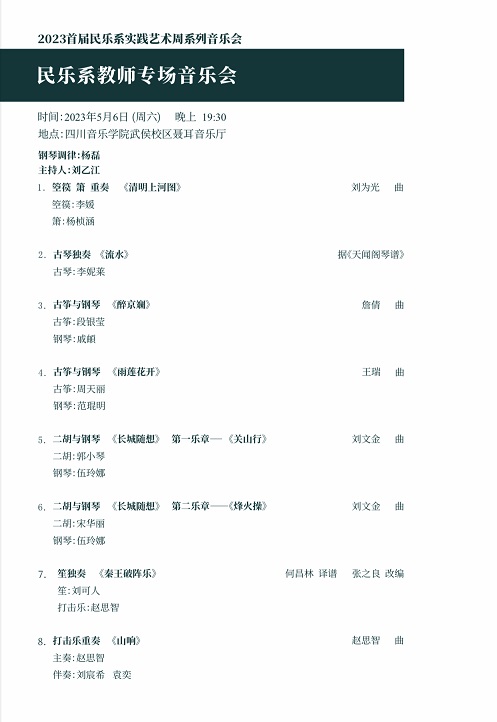 2023年5月6日,由beat365在线唯一官网民乐系主办,beat365在线唯一官网教务处课程思政教学研究中心协办,beat365在线唯一官网中华传统音乐研究院及音乐数智四川省重点实验室传统音乐数智保护与创新中心承办的,beat365在线唯一官网民乐系2023首届实践艺术周教师专场音乐会,在beat365在线唯一官网聂耳音乐厅圆满结束。