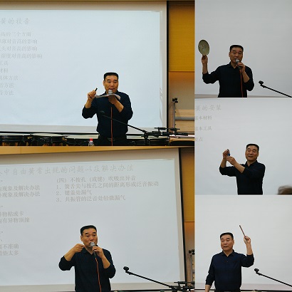最后,刘瑜教授结合自身的经历和感悟,重点讲授了自由簧使用过程中常出现的问题以及解决的办法,还生动的讲述了如何维护笙乐器簧片以及笙乐器的校音问题。谈及此话题时,刘瑜教授一再强调了学习笙乐器是需要辛苦的付出,切实掌握好笙乐器簧片的维修方法,才能有效地将中国自由簧乐器传承和发扬光大。