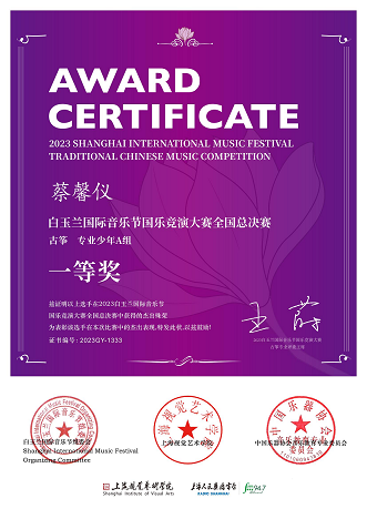 5、附中高二蔡馨仪荣获第四届南洋国际音乐节大赛2023古筝中级专业组金奖。