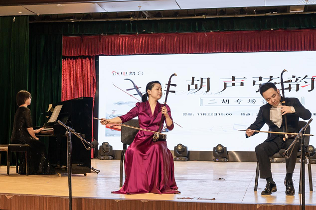 受电子科技大学大学生文化素质教育中心邀请,我系郭小琴、宋华丽、侯少哲、黄小玉、付雅璐、马霄汉6名教师带领二胡专业学生侯佳欣(研一)、弋佳鸢(大二)、王雪儿(大二)、雷振华(大四)、王秋蓓(高三)于2023年11月22日晚7点在电子科技大学沙河校区学生活动中心夏新厅成功举办了“胡声弦韵——二胡专场音乐会”。