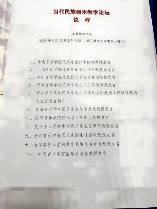 2024年3月27日,受中央音乐学院邀请,民乐系党委书记、系主任,音乐数智四川省重点实验室传统音乐数智保护与创新中心主任,张忠教授赴厦门参加了由中央音乐学院主办的“厦门·中国民族音乐节”。并在当代民族器乐教学系主任论坛上作了题为“乐韵传承,课教创新:谈数智时代民乐学科的系统性建设及教育路径”主题发言。讨论数智时代背景下中国民族音乐学科发展等问题。论坛邀请了国内11所独立设置的音乐学院民乐学科相关专家和主要负责人参加。是国内最高规格的一次国乐学术盛会。