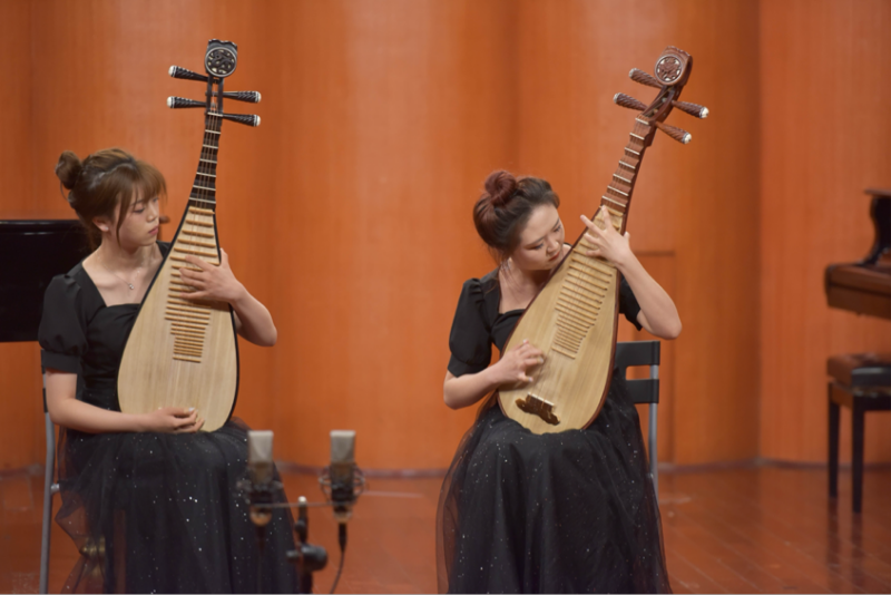 音乐会最后一首曲目是《龙船》,《龙船》是一首具有浓厚江南生活气息的琵琶作品,描写了端午节时龙舟竞渡的情景,作者运用了琵琶特殊的技巧,模拟锣鼓声、船声、划水声、歌声,并有机地吸收了苏南吹打和江南丝竹音乐的曲调,把节日情绪渲染得淋漓尽致。琵琶1:刘伊楠 琵琶2:林如意 指导老师:蒋纯