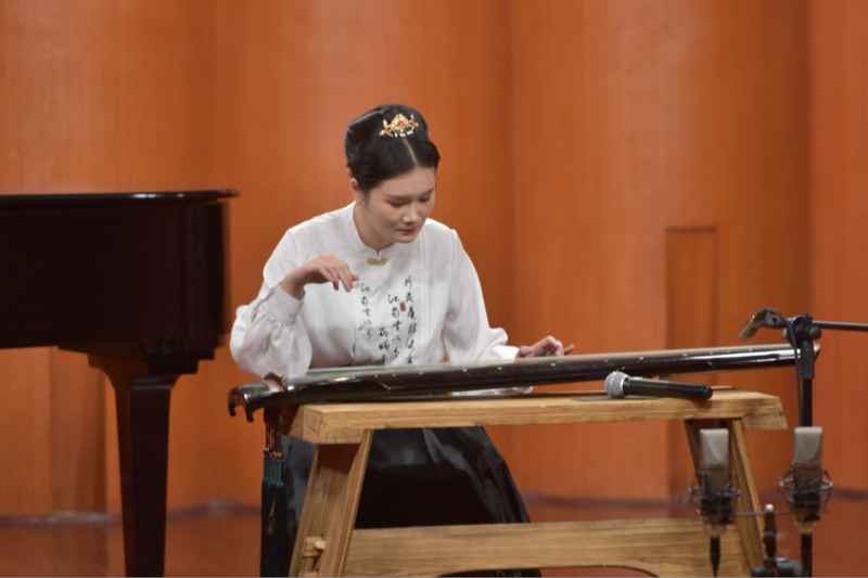 音乐会的第二首曲目古琴独奏《梅园吟》,《梅园吟》由古琴演奏家龚一先生和作曲家许国华先生于1978年创作,通过对梅园中梅花的赞咏,表达了对周恩来同志的敬仰和深切的怀念。作者对于古琴表现现代题材及提高古琴技巧的难度等方面作了有益的尝试。古琴演奏者:王羲然 指导教师:董雯雯