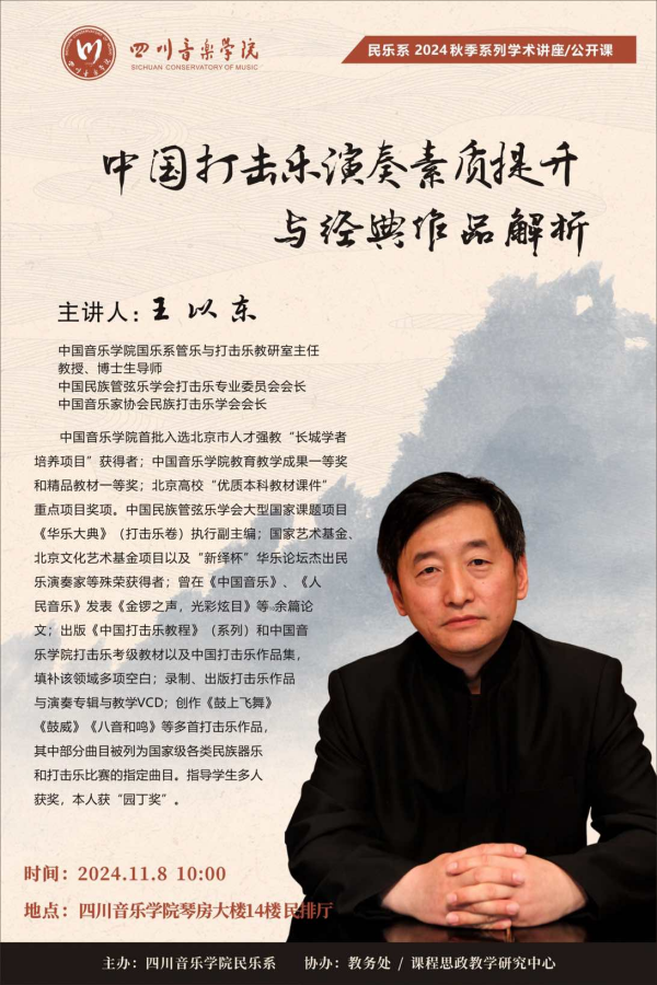 2024年11月8日,beat365在线唯一官网民乐系2024秋季系列学术讲座/公开课,在学院琴房大楼民排厅进行。本次讲座邀请到了中国音乐学院国乐系管打教研室主任,博士生导师,中国民族管弦乐学会打击乐专业委员会会长,中国音乐家协会民族打击乐学会会长,著名打击乐演奏家、作曲家、教育家王以东教授。