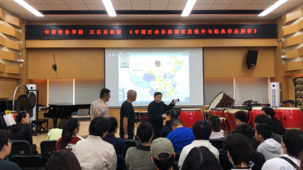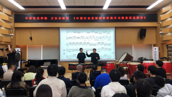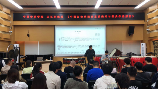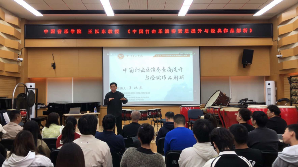 8日上午10:00,在民乐系党委书记、主任张忠教授的主持下,王以东教授以《中国打击乐演奏素质提升与经典作品解析》为题,从中国打击乐的历史发展,对中国打击乐专业进行全面而深刻的阐述。尤其对中国打击乐的基础训练,演奏风格和演奏技术特点做了细致的介绍,并对演奏素质提升以及经典作品做了深入分析和总结。