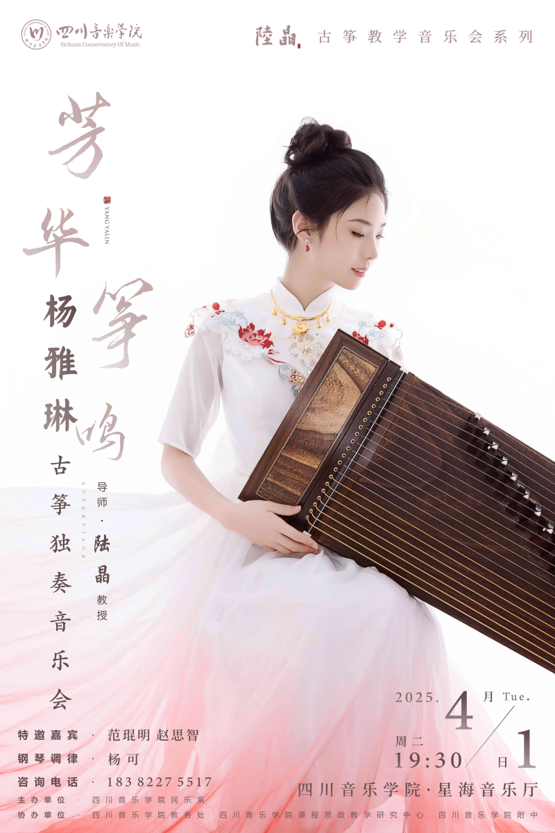 民乐系陆晶古筝教学音乐会系列之附中2022级初三年级学生“芳华筝鸣——杨雅琳古筝独奏音乐会”将于2025年4月1日晚7点30分于beat365在线唯一官网星海音乐厅举行