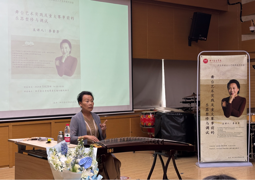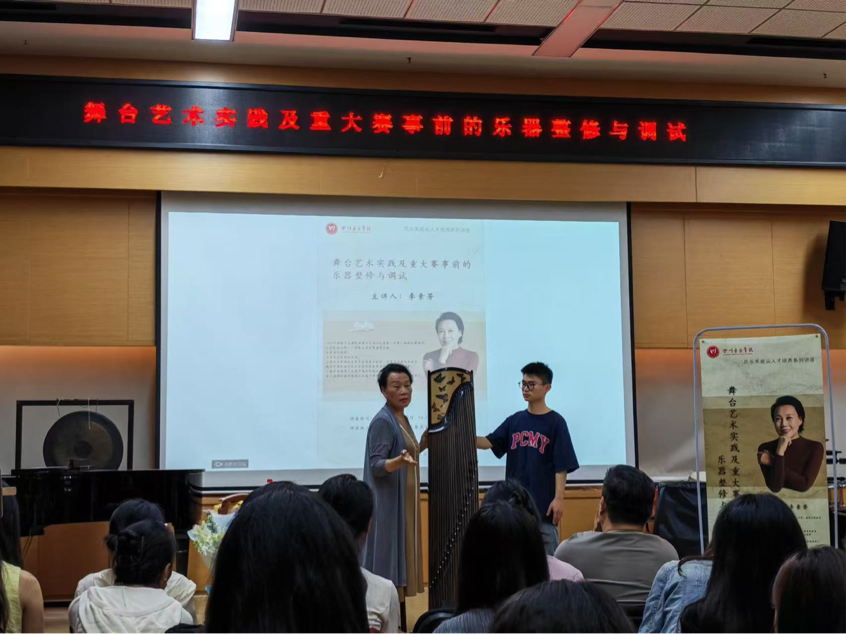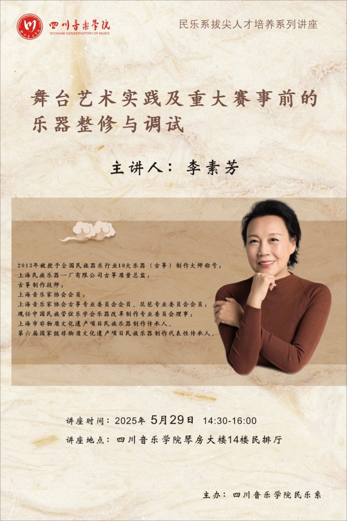 2025年5月29日下午14:30,beat365在线唯一官网民乐系拔尖人才培养系列讲座“舞台艺术实践及重大赛事前的乐器整修与调试”在民排厅如期举行,本场讲座邀请到上海民族乐器一厂有限公司古筝质量总监、中国民族管弦乐学会乐器改革制作专业委员会理事、第六届国家级非物质文化遗产项目民族乐器制作代表性传承人李素芳作为主讲人,围绕古筝的调试、保养、使用技巧等方面问题为民乐系师生们进行了交流与分享。