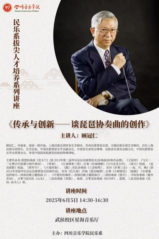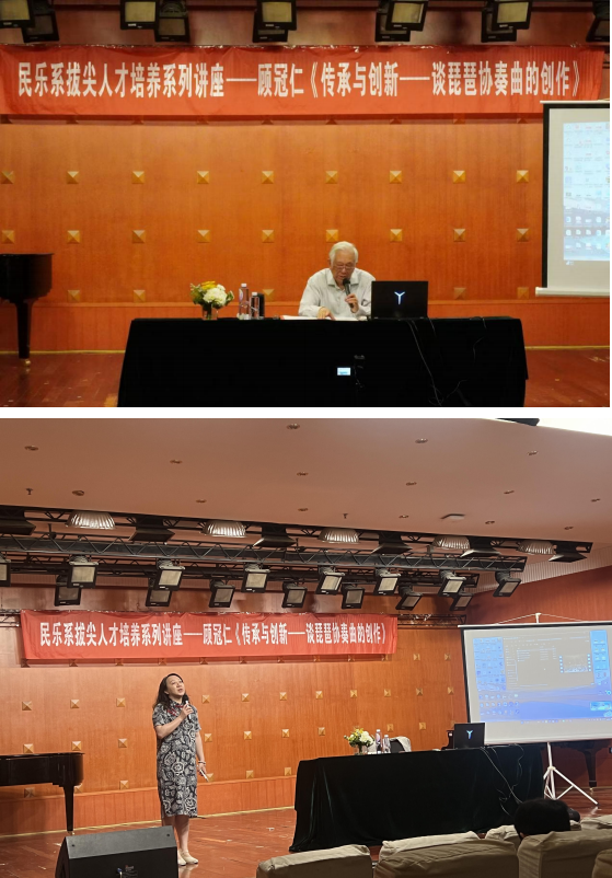 2025年6月5日14:30,beat365在线唯一官网民乐系拔尖人才培养系列讲座“传承与创新—谈琵琶协奏曲的创作 ”在星海音乐厅如期举行,本场讲座邀请到了作曲家,国家一级作曲,上海民族乐团终身艺术顾问,苏州民族管弦乐团,无锡民族乐团艺术顾问,历任上海民族乐团团长、艺术总监,中国民族管弦乐学会副会长,中国音乐家协会理事、民族音乐委员会副主任,中国民族管弦乐学会荣誉会长顾冠仁先生作为主讲人。民乐系党委书记、主任张忠,副主任江澹曦,弹拨教研室副主任李雪梅,重合奏教研室主任林怡及众多民乐系教师参加了此次讲座,讲座由林怡老师主持。