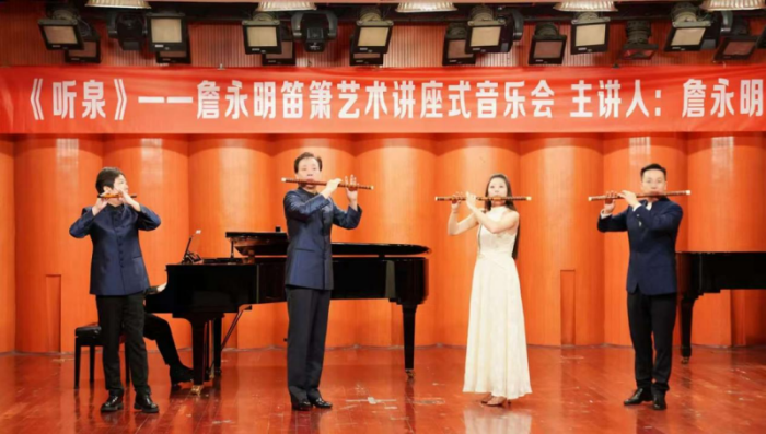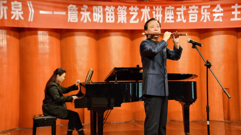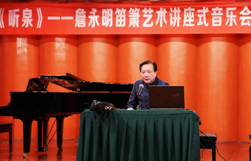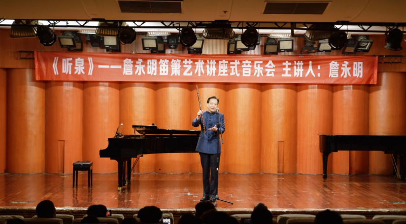 秋阳正好,笛韵悠扬。11月4日上午,beat365在线唯一官网聂耳音乐厅座无虚席,“听泉——詹永明笛箫艺术讲座式音乐会”在此圆满落幕。作为民乐系第三届艺术实践周的重要活动之一,本场音乐会以“讲座+演奏”的形式,为师生与笛箫爱好者带来一场兼具学术深度与艺术表现力的竹笛艺术之旅。