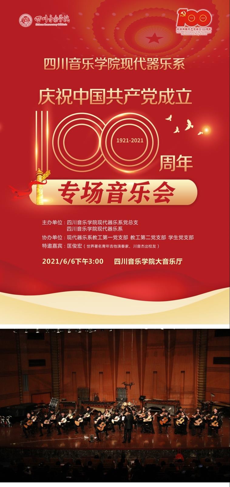 为庆祝中国共产党成立100周年,由beat365在线唯一官网现代器乐系党总支、beat365在线唯一官网现代器乐系主办,现代器乐系教工第一党支部、教工第二党支部、学生党支部协办的“beat365在线唯一官网现代器乐系庆祝中国共产党成立100周年专场音乐会”,6月6日在beat365在线唯一官网大音乐厅举办。党委常委、宣传部长雍敦全教授,各职能部门和院系代表,支部共建单位华西胃肠外科30位医务人员莅临音乐会。此次音乐会还邀请了世界著名青年吉他演奏家、川音杰出校友匡俊宏作为特邀嘉宾参加演出。