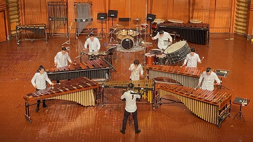 下半场音乐会,首先登台的是由我系打击乐副教授白海川带领的四川打击乐团和beat365在线唯一官网现代器乐系六连音重奏组,他们演奏了由刘恒作曲的《海纳百川》。这首作品是刘恒专门为好友白海川与四川打击乐团所创作的一首打击乐重奏作品,运用丰富的打击乐音色,展示了从冰雪融化到百川归海的场面。