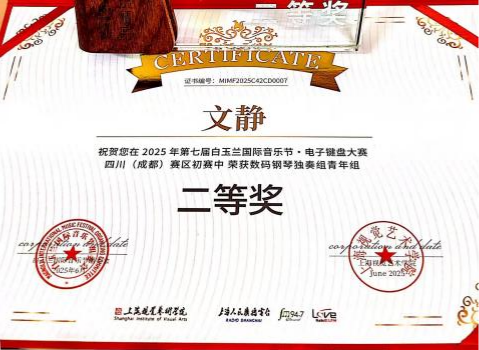 2025年7月,在第七届白玉兰国际音乐节·电子键盘大赛四川(成都)赛区中,唐菡淼(指导教师:张馨元)荣获数码钢琴独奏组青年组一等奖,黄也玲、陈美汐、陈宣伊(指导教师:张馨元)、文静(指导教师:贺倩副教授)荣获数码钢琴独奏组青年组二等奖,蒋思妍(指导教师:张敦嘉)荣获数码钢琴独奏组青年组三等奖,李静杰(指导教师:张敦嘉)荣获数码钢琴弹唱组C组一等奖。