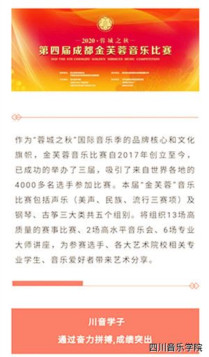 在第四届成都金芙蓉音乐比赛中,经过激烈角逐,我系2018级学生程星韵取得优秀奖。特向全系报喜,并向程星韵及何姣老师、声乐艺术指导曾亮老师表示热烈祝贺!