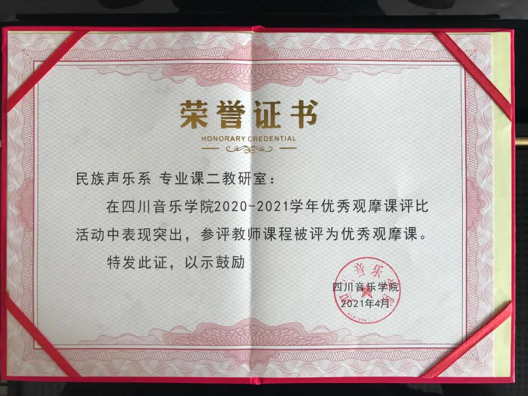 2020年秋季学期,由教务处组织,相关职能部门协助,各教学单位(教研室)积极开展了教学观摩活动。经教务处2021年4月研究评比,对在观摩活动中表现优秀的教研室进行了表彰,并于昨日下午(2021年6月1日)在琴房大楼一楼114办公室举行了表彰仪式。民族声乐系专业课二教研室获此殊荣,参评教师为陈辉教授,参评课程被评为2020—2021学年优秀观摩课。向获奖教研室及陈辉老师表示热烈祝贺!