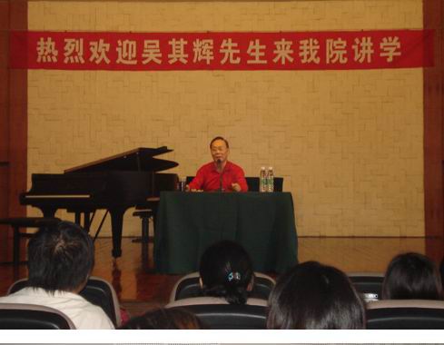 九月二十、二十一日,声乐一系特邀中央交响乐团声乐指挥、国家一级演员吴其辉先生到我系讲学。 吴先生讲述了他在意大利留学的经历及体会,介绍了目前国内声乐的现状及误区,回答了师生有关声乐方面的诸多问题,吴先生的讲学风趣幽默、精练准确,受到了热烈的欢迎。 吴先生还利用了两天下午的时间,给部分青年教师和尖子生上了几节公开小课,师生们均认为收获颇多、提高较大。