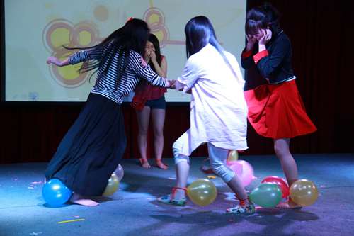 第二个环节是游戏和抽奖,其目的是培养同学们的集体主义意识。良好的配合和合作是歌剧与合唱两个专业非常重要的共同特点。该环节采用了参与性强而又喜闻乐见的游戏节目,让全体同学参与进来,感受到自己是集体的不可或缺的一份子,每个人都是我们这个集体的主人。虽然是传统的“抢椅子”,“踩气球”等游戏项目,却在大家的积极参与和配合下,完成得非常完美。现场一片欢声笑语,使气氛达到了晚会的高潮。