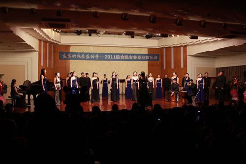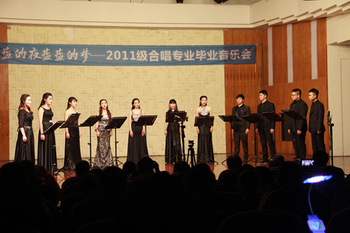 新年伊始,1月5日晚,一场名为“蓝蓝的夜蓝蓝的梦——2011级合唱专业毕业音乐会”在我院小音乐厅举行,音乐会吸引了各地亲友与各界音乐爱好者前来观看,音乐厅座无虚席,连过道都摆满了临时加座。由于本场音乐会既是毕业音乐会也是合唱专业考试,参加评审工作的老师由歌剧合唱系副系主任(主持工作)唐竹雅副教授领衔,成员有:张峰教授、郭永厚教授、刘青副教授、郭江滨老师、刘芬芳老师、易丹老师。 音乐会开场由指导教师朱曦老师对合唱专业毕业音乐会(考试)的意义及对音乐会作品量作品风格等的要求到2011级合唱专业这个群体进行了简要的介绍:这个群体是歌剧合唱系建系以来招收的第一届学生也是唯一一次独立设考场招收的学生,学生们在校期间演唱了上百首不同风格的合唱作品,参加了校内外数十场演出并两次参加文化部主办的合唱比赛都获得了第一名,充分体现了合唱专业办学日益成熟,也印证了合唱专业课程设置、考评制度等的合理性及科学性。 音乐会上同学们演唱了歌剧、室内、宗教、流行等风格的18首合唱作品,充分展示了大学四年的学习成果,一首《蓝蓝的夜,蓝蓝的梦》寄托了本届毕业班对大学的留恋,以及对未来的展望和对亲友老师们的感谢,将音乐会推向高潮。音乐会结束后学生代表发言表达对母校、老师、亲友的感谢,将一首《月亮代表我的心》送给全场观众,学生们纷纷留下了不舍的泪水。