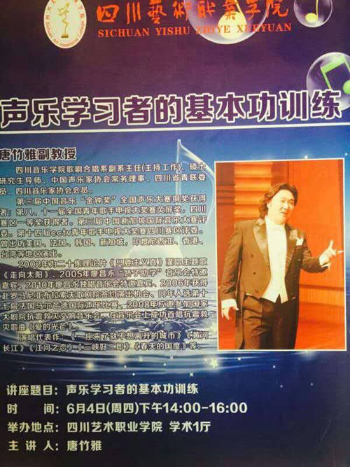 6月4日唐竹雅副教授应四川艺术职业学院音乐系邀请进行学术交流讲学,唐主任在了解了听课学生声乐水平之后,针对声乐初学者们精心准备了一堂名为制造“歌唱乐器”的交流课程。 唐主任深入浅出的剖析了声乐学习者的“乐器”(发声器官)的构造以及科学发声的重要性,分别对喉头位置以及呼吸方式等问题进行了独到的分析和讲解。并突破传统交流讲学的模式,用自己的研究生现场示范教学,让在场的师生对讲学内容有了更加直观的认识和了解。 随后,唐主任根据德国声乐划分体系对每个声部的特色、特点进行了详细的解说,并以精心准备的声乐视频呈现给了全场听课师生。四川艺术职业学院音乐系的师生对本次交流讲学展现出了浓厚的兴趣,整个会场座无虚席,师生们一边仔细聆听,一边跟着唐主任一起做发声练习。 课程完成之后,音乐系党委书记马力对此次交流活动予以了高度评价,希望今后能和我院再次进行如此精彩的学术活动。