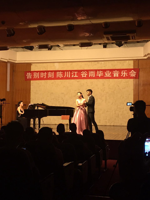 2015年6月15日晚7:30在我院小音乐厅,歌剧合唱系副系主任唐竹雅教学班两位应届毕业生陈川江、谷雨成功举办毕业独唱音乐会,本次音乐会吸引了各地亲友与各界音乐爱好者前来观看,音乐厅座无虚席。 本场音乐会由郭永厚教授和青年教师谭赟担任音乐会的艺术指导。其中曲目风格包含中国传统戏曲风格,中外艺术歌曲,咏叹调,二重唱和音乐剧等等,展示了学生演唱风格的多样性,得到了各界的一致好评。 最后音乐会以一首《心中的玫瑰》,在感谢母校,感谢恩师的掌声中画上了圆满的句号。