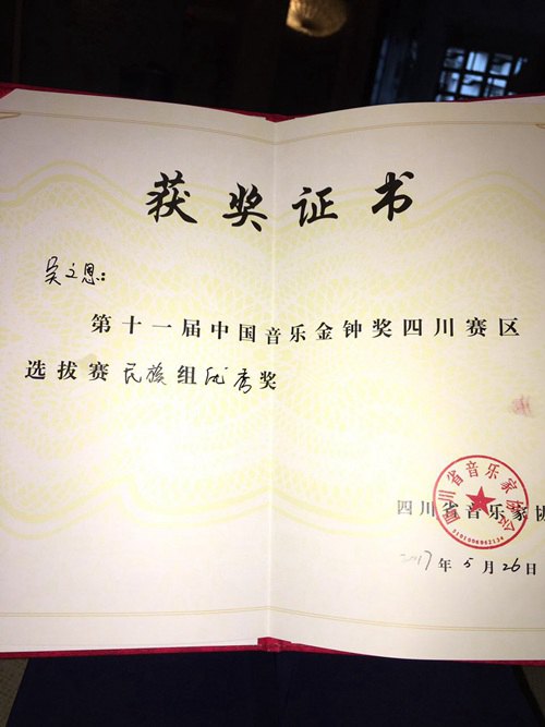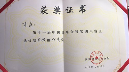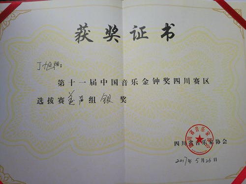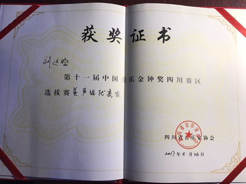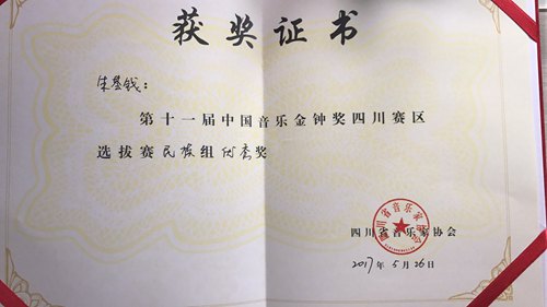 我系青年教师与学生喜获第十一届中国音乐金钟奖四川赛区选拔赛奖项 2017年5月21日至5月26日,由四川音乐家协会主办的第十一届中国音乐金钟奖四川赛区选拔赛在彭州市白鹿镇隆重举行。我系青年教师叶琤,研究生丁旭阳、刘远晗、袁遥、朱荟钱、吴文思,本科生李翔经过初赛、半决赛、决赛三轮激烈角逐之中于百名专业选手当中脱颖而出,分别获得美声专业组银奖(丁旭阳)指导教师唐竹雅教授,美声专业组铜奖(叶琤)以及美声专业组优秀奖(刘远晗)指导教师唐竹雅教授。民族专业组金奖(李翔)、优秀奖(袁遥、朱荟钱、吴文思)指导教师陈万教授。在这里向他们表示祝贺,同时也向他们的专业指导教师表示感谢与祝贺!